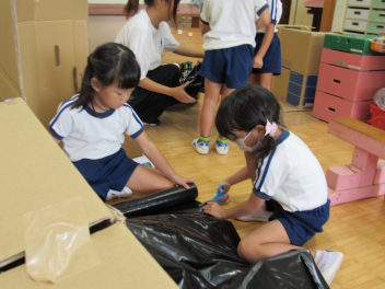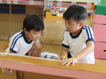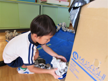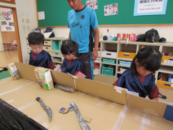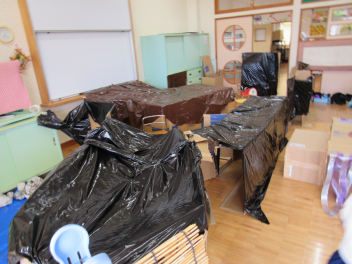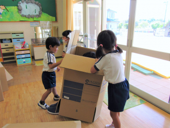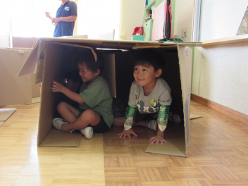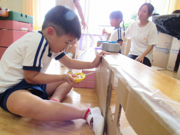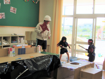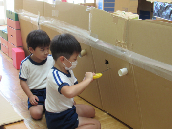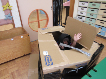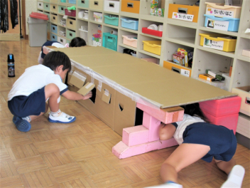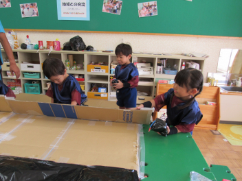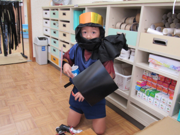 忍者屋敷づくりは少し停滞気味です、、、。“忍者屋敷”をイメージするのは子供にとってはとても難しいので、絵本や図鑑を見たり、先生からいいアイディアをもらったりしながら進めています。
