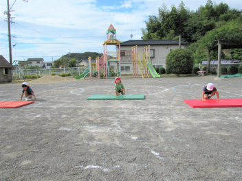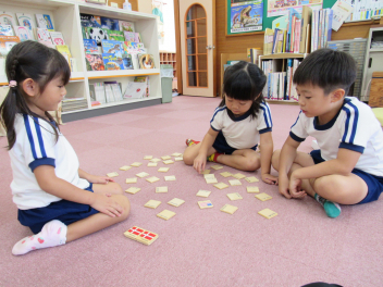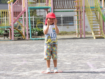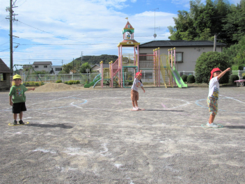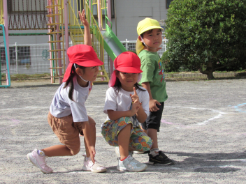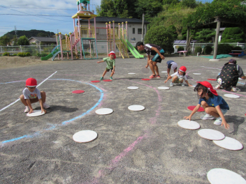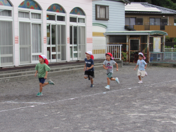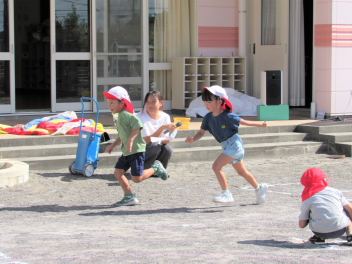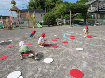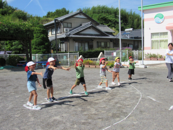 2チームに分かれて、対抗ゲームをしました。競い合う遊びはとても盛り上がります。勝った時の喜びや嬉しさを味わったり、負けた時の悔しさを感じたり、もう一回やりたいという挑戦心をもったりします。チームの友達と仲間意識を感じることができるのも対抗戦のよさのひとつです。