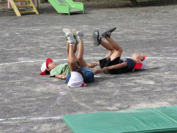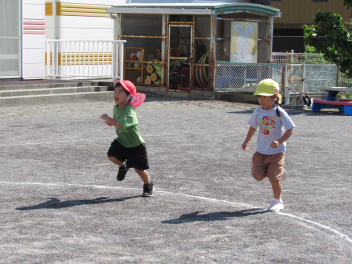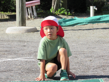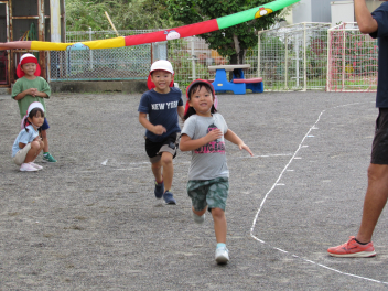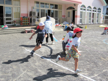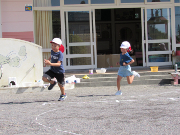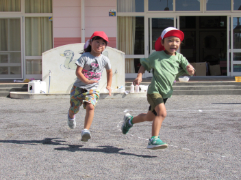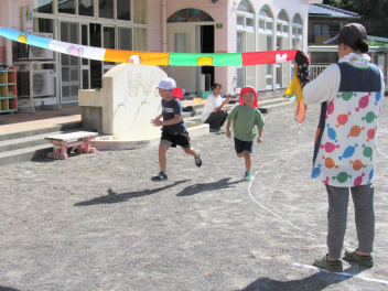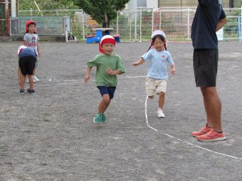 先生がゴールテープを出してくれました。ゴール目指して何回も、友達と『よーい、どん!』をしました。