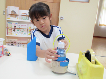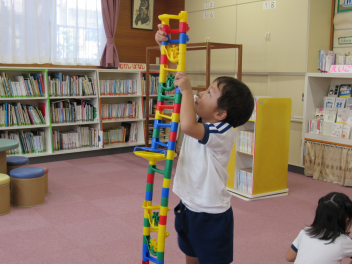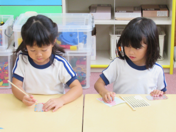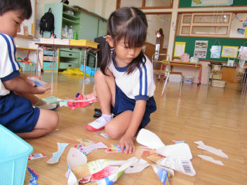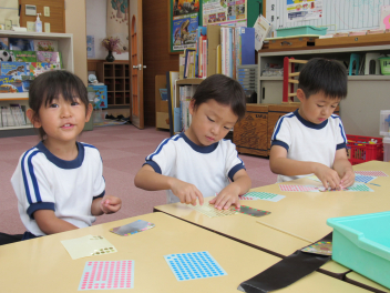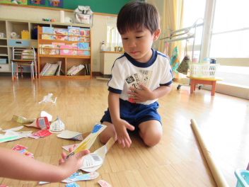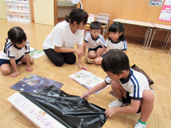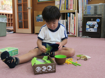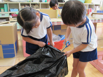年少さんは新しい遊びを始めるために、今までの遊びの片づけをしました。