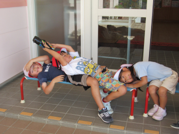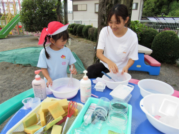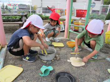 今日も暑い日になりましたね。少し動いては、休憩と給水をしながら外遊びをしました。
