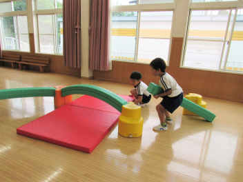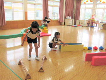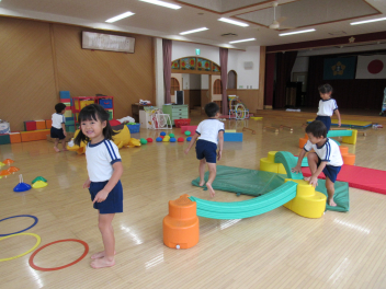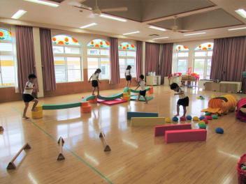 準備体操をしてホールへGO! 今からサーキット遊びをします。