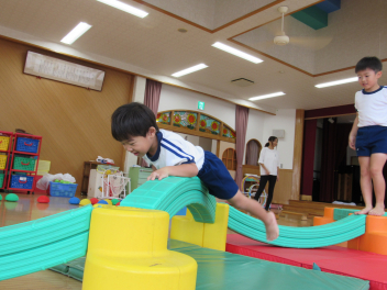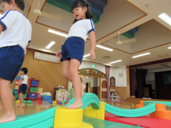 久しぶりに雨の朝でした。休日にパワーをフル充電してきた子供たち。ホールで玉入れゲームやバルーンなどで体を動かして遊びました。