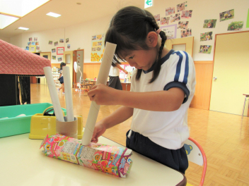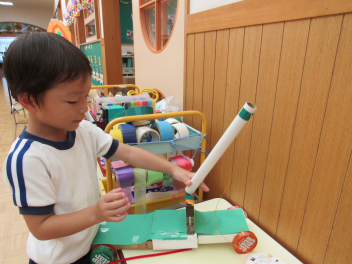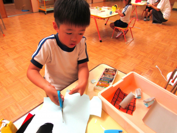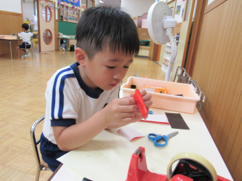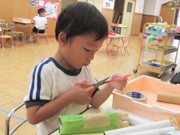 たっぷり体を動かした後は、製作遊びを楽しみました。自分の好きなものやイメージしたものを廃材などを使って、じっくり集中してつくっていました。