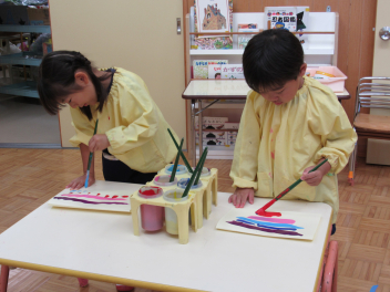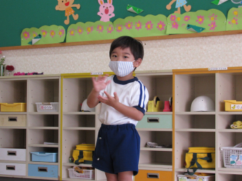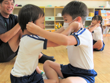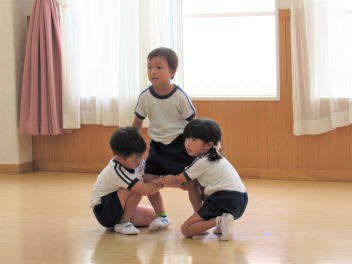 年長さん、年中・年少さんに分かれてのリズム表現も楽しく進めています。今日はお互いに「見せ合いたい」ということで、見せ合いっこをしました。