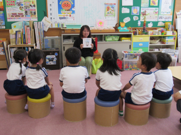 絵本ボランティア読み聞かせの日でした。『てんはません』の絵本は、毎日見ている身近な乗り物なので、興味津々で見入っていました。
