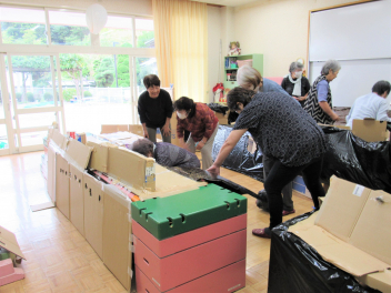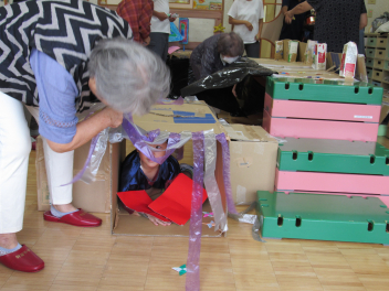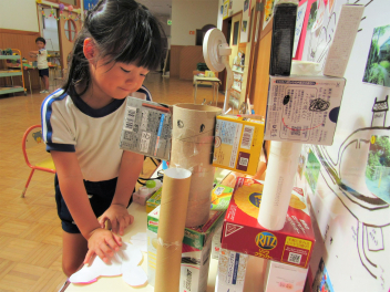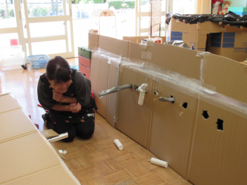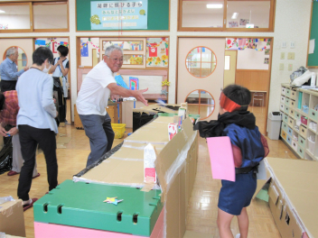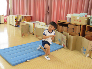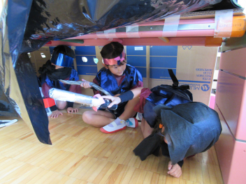 忍者修行ができるように、つくったものを並べてみました。これがなかなか難しくて、先生も一緒になって、「こうしてみる?」「この方がいいかな?」と、迷路のようにつなげていきました。まだ完成とまではいきませんが、あと、もう少しかな?