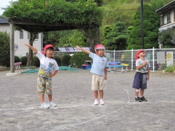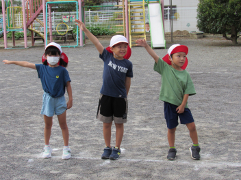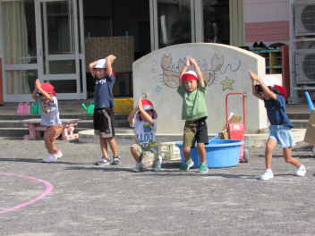 今日は暑いくらいのお天気でしたね。園庭でリズムダンスを踊りました。