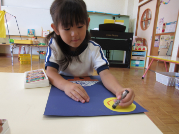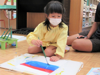 年少さんも万国旗づくりをしました。デカルコマニーの技法を使って、素敵な国旗が何枚もつくりました。