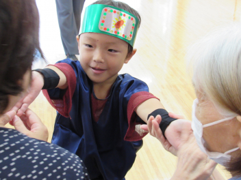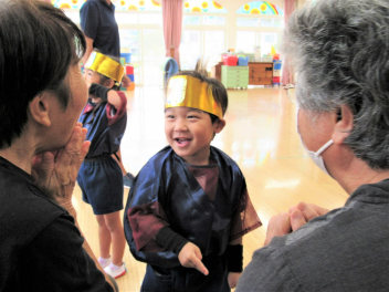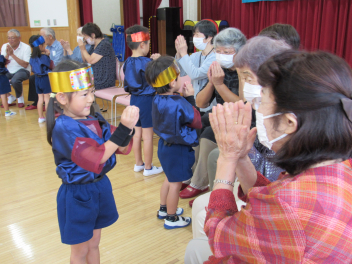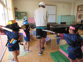 子供たちは屋敷に隠れながら、敵に見立てたおじいちゃんおばあちゃんに手裏剣や爆弾を投げました。初めはびっくりしていたおじいちゃんおばあちゃんですが、おじいちゃんおばあちゃんも負けじと手裏剣や爆弾を投げ返して、忍者たちをやっつけていました 笑笑 (※手裏剣や爆弾は危なくないよう配慮してあります。)