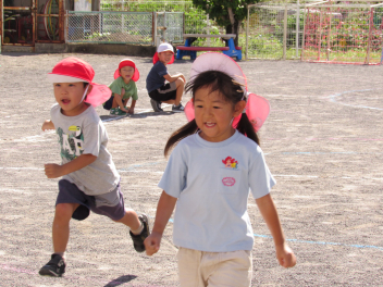 園庭でかけっこや玉入れを楽しみました。曇り空で気持ちのいい風が吹いていて、絶好の外遊び日和でした。