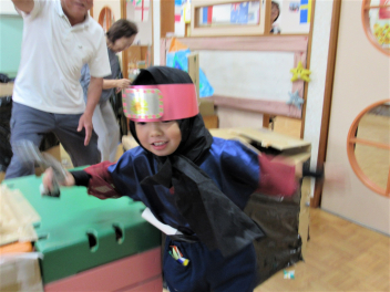 忍者屋敷ができたので、忍者の衣装を身に着けて忍者ごっこをしました。
