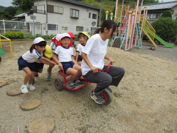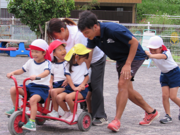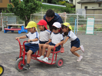 「先生も乗っていいよ~!」「あ、ありがとう、、、」恐る恐る三輪車にまたがりました。子供でも3~4人集まると押す力が強くて、猛スピードが出ました。運転手の先生は「も、もっと ゆっくりね~っ!!」と、冷や汗をかいていました。