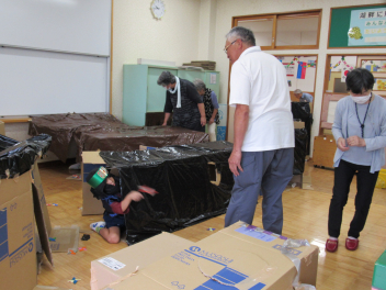 空気は涼しくても湿度が高かったせいか、汗びっしょりになった子供たち。着替えをしてから休憩を挟んで、忍者屋敷づくりをしました。