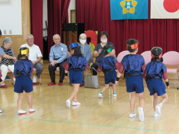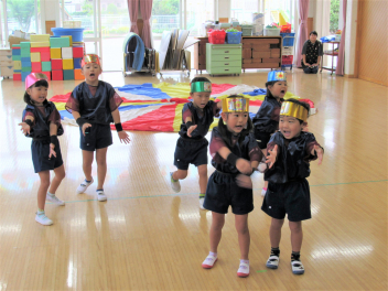忍者ごっこの次は、ホールへ移動して、運動会で踊るダンスを披露したり、手遊び等のふれあい遊びをしたりしました。