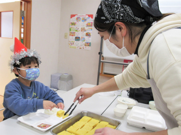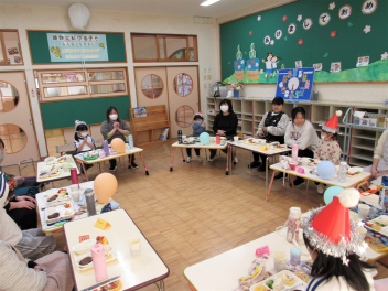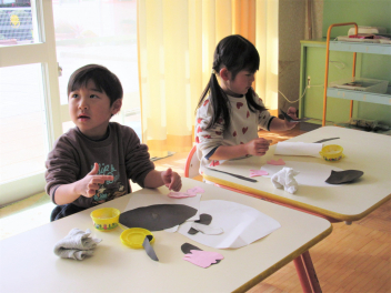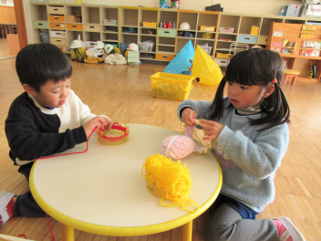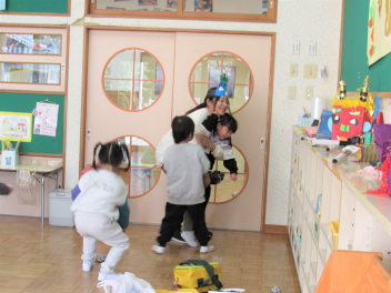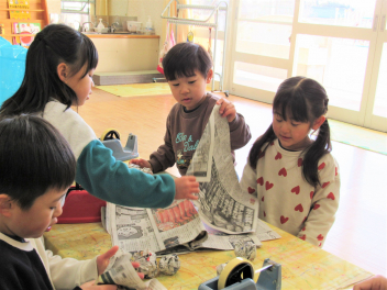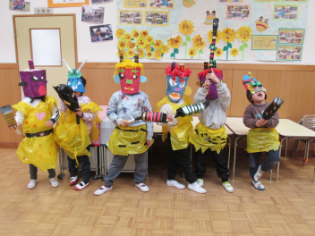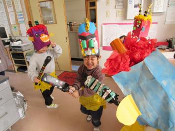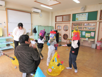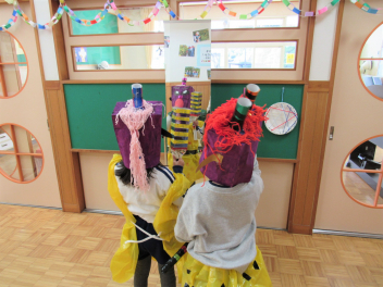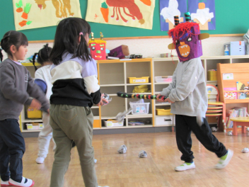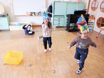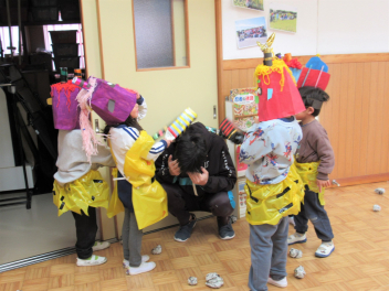 早いもので、来週は節分で豆まき会があります。鬼のお面や新聞紙を丸めて豆をつくって、鬼退治ごっこが始まりました。