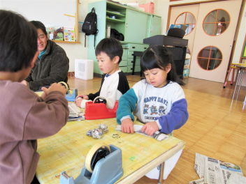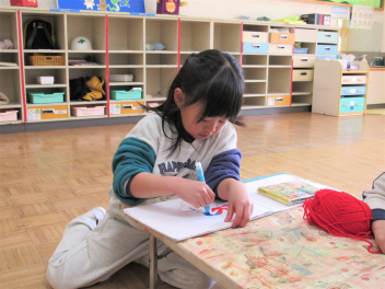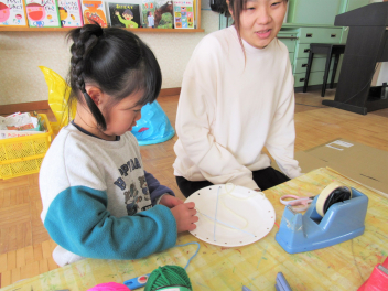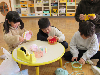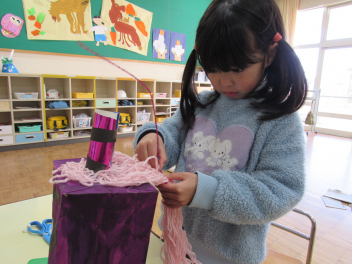 その他、製作遊びもしました。年長さんは、編み物(マフラーづくり)が始まりました。