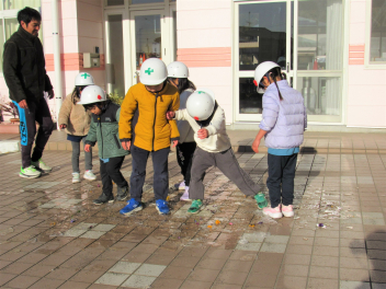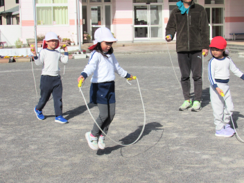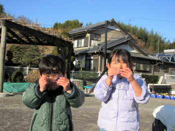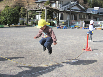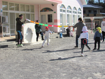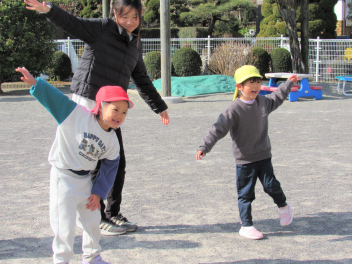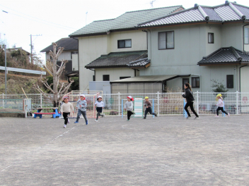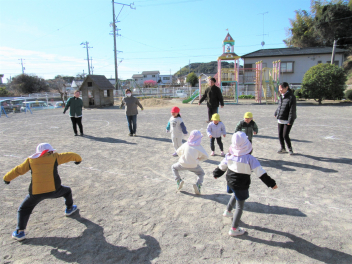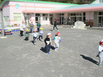 3学期は“ひまわりっ子集会”をします。年長さんが司会をしてくれます。体操やマラソン、集団遊びなどをして寒くても元気に戸外で遊びます。でも今日はとても暖かい日で、汗をかくくらいでした。