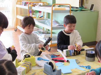 今度は鬼退治遊びに必要なものをつくっています。牛乳パックや細長い筒などを使って、金棒をつくっていました。