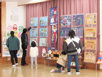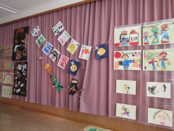 今日から、西気賀幼稚園子どもの市展が始まりました。一年間の絵画製作作品が並び、見応えがあります。また、作品をとおして、成長の姿も感じられます。地域の方もぜひ、見にいらしてくださいね。