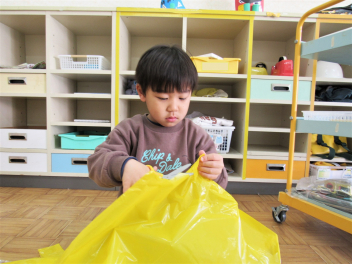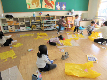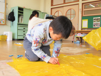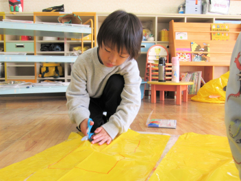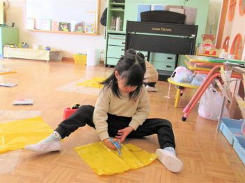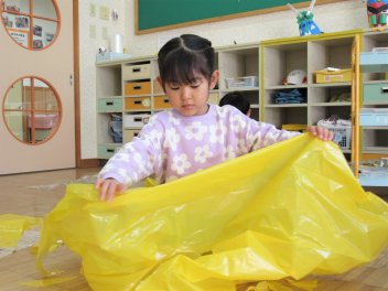 • 鬼のお面ができたので、今度は鬼の服をつくることになりました。カラーポリ袋を使って、思い思いにつくっていきました。