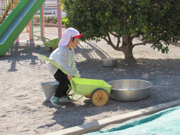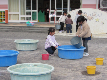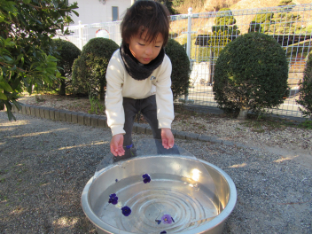 「寒いから、氷ができるかな?」と、タライやバケツを園庭に並べました。明日の朝、氷ができるといいね!