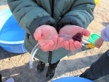 登園するとすぐにタライやバケツを見に行きました。すると、待望の氷が出来ていました!!