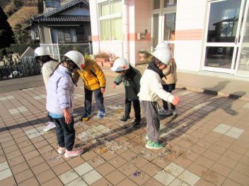 職員室前に氷をまいて、スケートをしました。でも氷がすぐとけてしまい、あまり滑りませんでした。