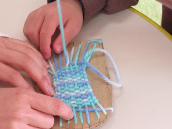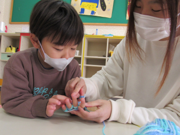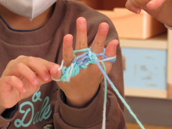 「毛糸で遊びたいな」と、毛糸をひと玉持ってきた男の子は、先生に指編みや段ボール編みを教えてもらいました。