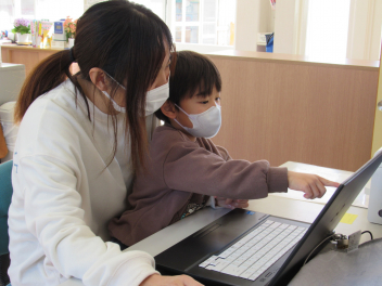 「“こくご”の時間だよ」と、文字に触れた遊びをしていました。