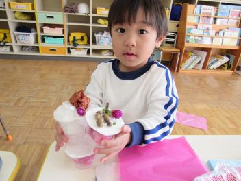 たっぷりと体を動かして遊んだ後は、製作遊びを楽しみました。