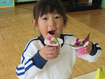 年少さんは、秋の木の実や園庭の自然物を使って、ケーキづくりをしました。