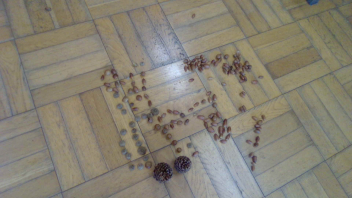 「ならべてならべて」の学習をしました。どんぐりやまつぼっくり、葉っぱ、石を並べて、家や城、道などを作りました。色や形に注目して、並べ方を工夫することができました。友達と協力しながら作りました