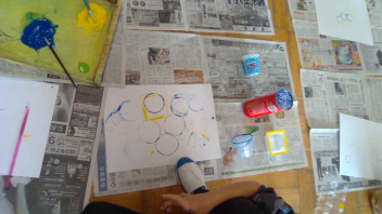 「うつしたかたちから」の学習です。段ボールやプリンカップ、洗濯ばさみなど色々な材料の形をうつしました。うつした形を見て、「すごーい!」「きれーい!」と、楽しむ声がたくさん聞こえてきました