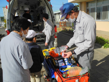 消防士さんや救急救命士さんの仕事について説明を聞いたり、消防車や救急車の装備品や放水の様子を見せていただいたりしました。