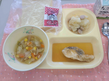「 パン、牛乳、チョコ大豆クリーム、たらのレモンソースかけ、ジャーマンポテト、野菜スープ 」でした。