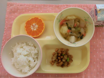 「 ごはん、牛乳、たらと大豆の甘辛あえ、すいとん汁、みかん 」でした。