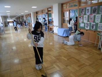 今日は、行事との兼ね合いで学級単位で清掃を行いましたが、普段は、縦割りのグループによる「縦割り清掃」を行っています。みんな、静かに分担場所をきれいにしています。