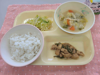 「 ごはん、牛乳、富士山コロッケ、チンゲンサイともやしのおかかあえ、静岡野菜たっぷり豚汁 」でした。