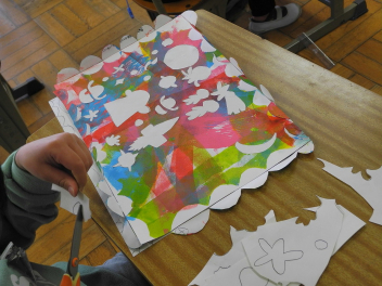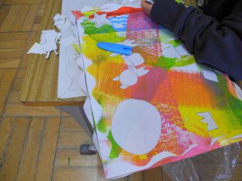 •  ローラーでカラフルに色づけした画用紙の上に、好きな形に切ったシールを貼っていきます。次回は、この台紙とシールを、黒いインクで塗りつぶします。その後、シールをはがすと、カラフルな台紙の色が出てきます。
