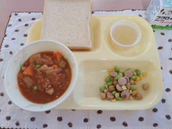 「 パン、牛乳、チキントマトシチュー、ウインナーとビーンズのソテー、りんごゼリー 」でした。