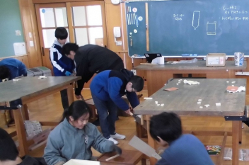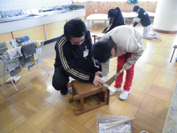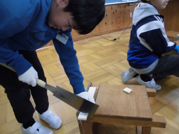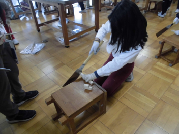 •  図画工作科で、のこぎりを使いました。木の棒を短く切り分けているところです。指や足を切らないように、注意深く取り組みました。