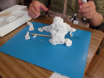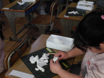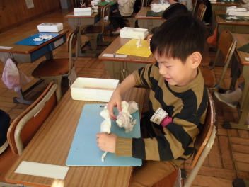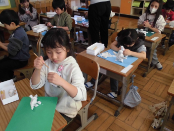 自分が思い浮かべたことに合う形をイメージしながら、粘土で表現する学習です。みんな、ペットや動物、ゲームのキャラクターなど、自由な発想で、いっしょに散歩する場面を表現しようとしていました。