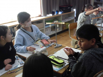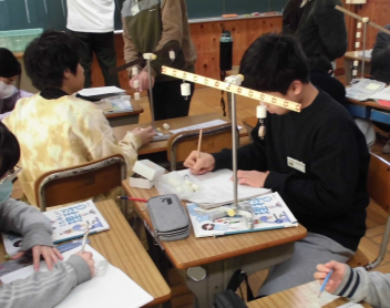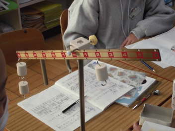 •  理科「てこのはたらき」では、実験用てこを使って、てこがつり合う場合のきまりについて考えています。