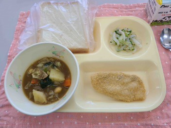 「 パン、牛乳、ホキのおからフライ、セロリのサラダ、カレースープ 」でした。
