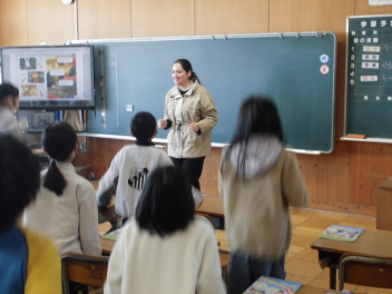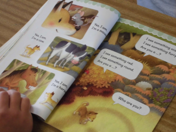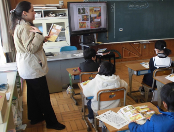 •  外国語活動で、挿絵に隠れている動物探しをしています。ALTのマリエム先生が、動物の特徴を英語で説明して、子供たちがその動物を英語で答えます。