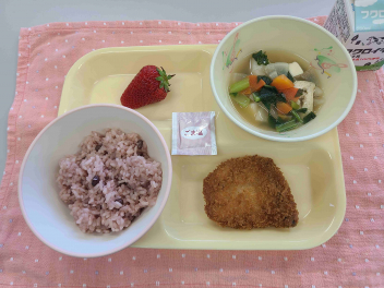 「 赤飯、牛乳、ごま塩、ぶりフライ、実だくさん汁、いちご 」でした。