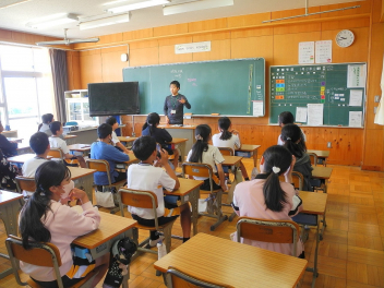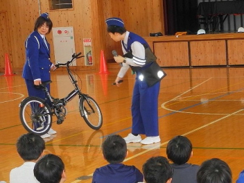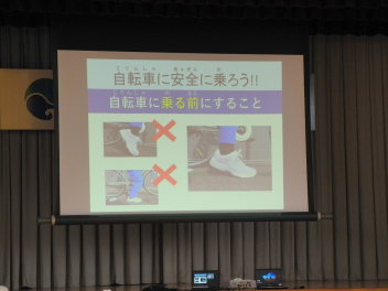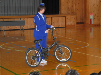•  今日は、1年~4年生を対象に、交通教室を行いました。3・4年生は正しい自転車の乗り方について、1・2年生は道路の安全な歩き方について学びました。