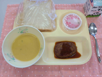 「 パン、牛乳、煮こみハンバーグ、豆乳コーンクリームスープ、さくらゼリー 」でした。