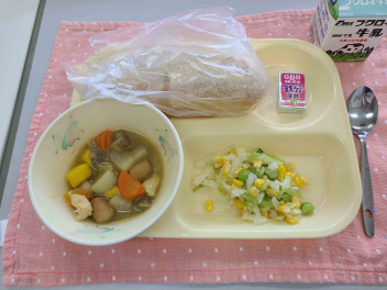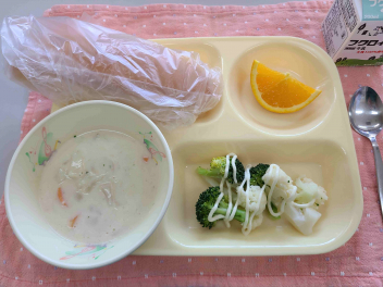 「 パン、牛乳、クリームシチュー、はなやさい、オレンジ 」でした。